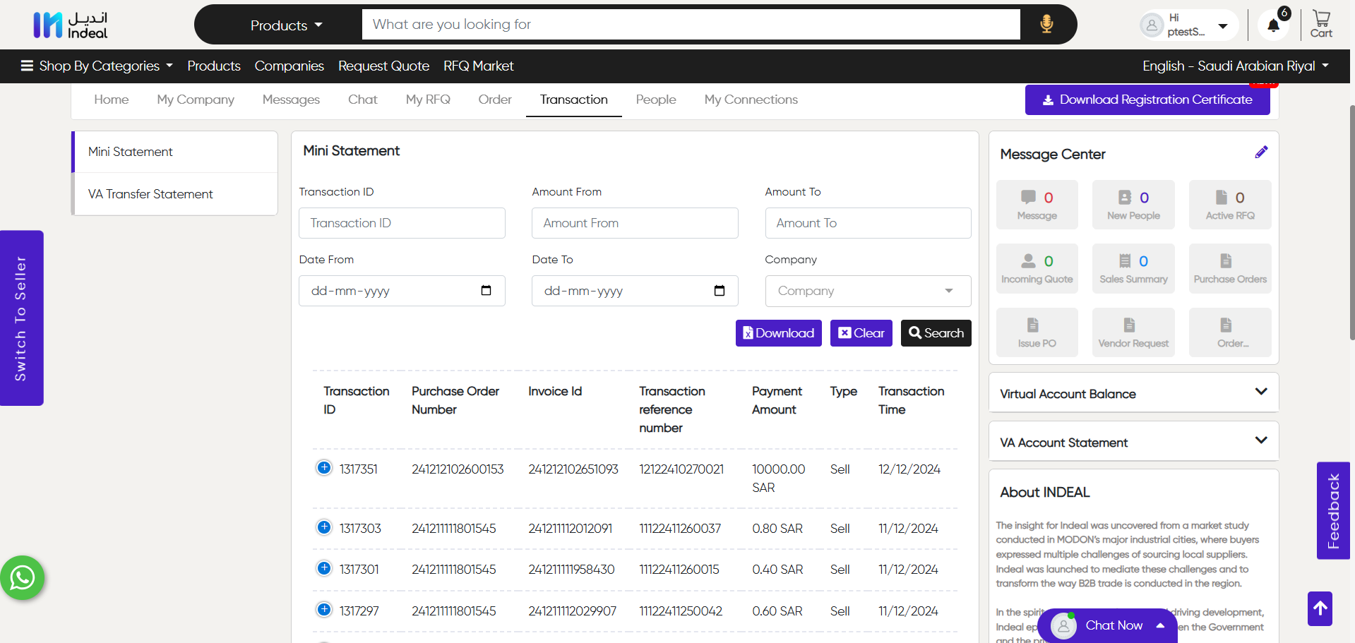 Indeal is a full-scale B2B e-commerce platform enabling businesses to manage procurement, RFQs, product listings, and financial transactions within a structured enterprise environment.