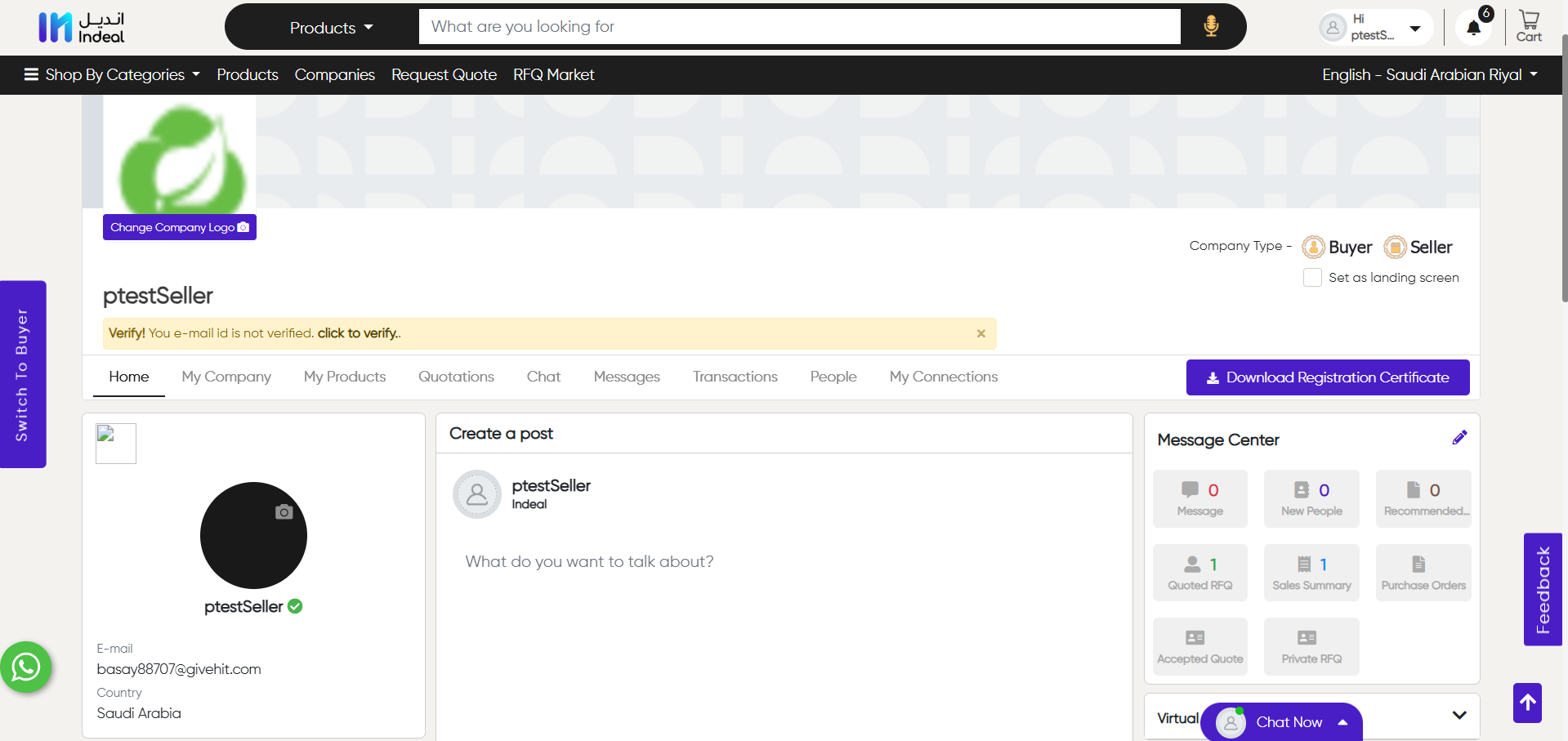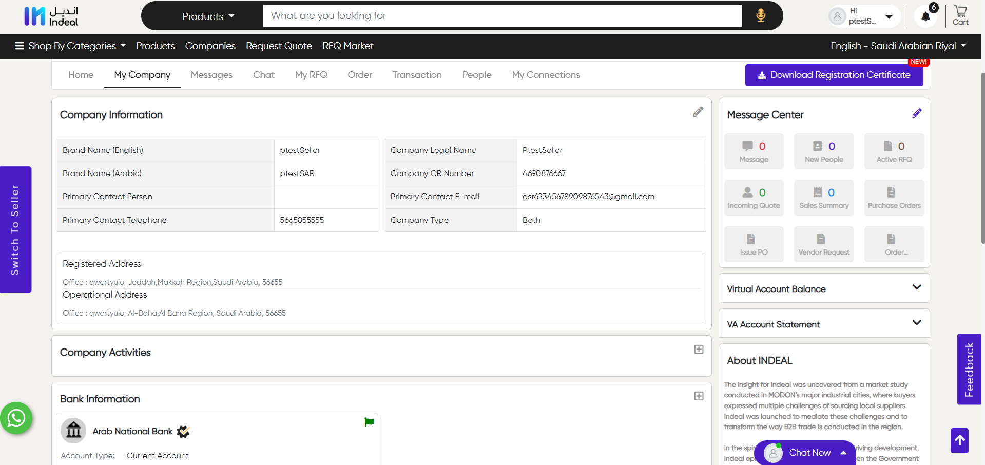 Indeal is a full-scale B2B e-commerce platform enabling businesses to manage procurement, RFQs, product listings, and financial transactions within a structured enterprise environment.